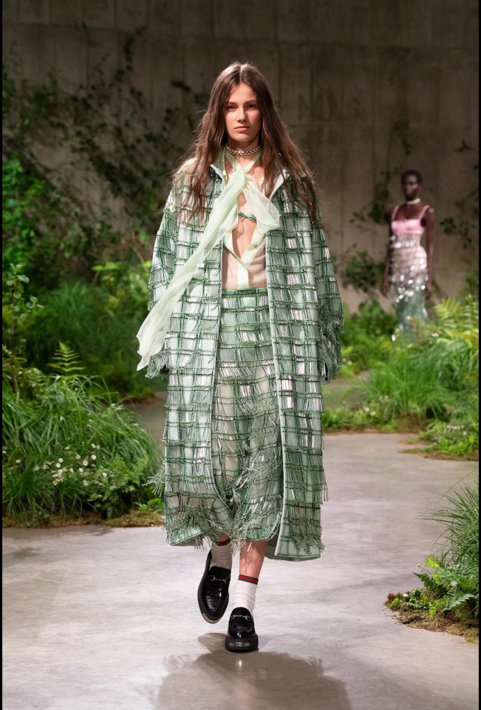 Non ci sono calzature con i tacchi, ma solo ballerine con dettaglio horsebit e mocassini che reinterpretano il design delle celebri creepers londinesi, indossate con calzini alla caviglia decorati dall’inconfondibile banda rossa e verde Gucci. Una scelta, quelle delle scarpe basse, fatta con l’intento di trasmettere un’idea di dinamicità, di movimento urbano e ancorato alla quotidianità.