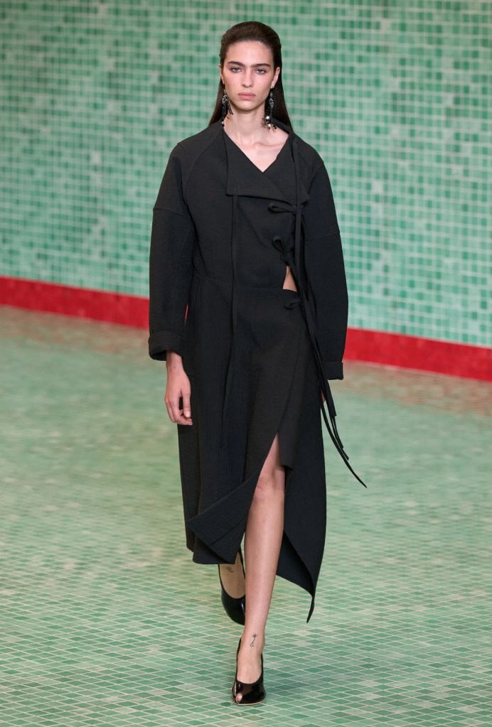 Pieter Mulier per Maison Alaïa decide di sfilare al Guggenheim Museum: lo spettacolo si è snodato sulla spirale della rampa progettata da Frank Lloyd Wright. La collezione è stata un assemblaggio di forme geometriche e linee curve, vortici di tessuto e minimalismi: fasce trasparenti abbinate a gonne ampie, alleggerite dall’uso di chiffon di seta; tuniche in maglia metallica; giacche corte, lanose e sporgenti; abiti senza spalline, cerniere o cuciture, che si snodavano sul corpo come un’architettura firmata Lloyd Wright.