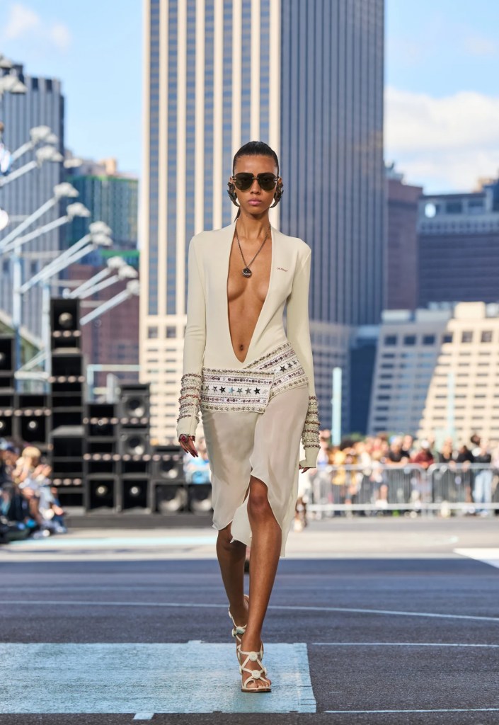 La sfilata Off-White primavera estate 2025 alla New York Fashion Weekè un omaggio ad Abloh. L’ispirazione principale di Ib Kamara, alla direzione creativa del brand, è arrivata dopo un viaggio in Ghana, il Paese da cui sono emigrati i genitori di Virgil Abloh. “Facevo ricerca nei mercati del luogo, acquistavo lì i tessuti, e lavoravo con gli artigiani locali. Questa esperienza mi ha dato tante emozioni. Ho chiamato la collezione Duty Free: l’ho pensata per una donna appena arrivata a New York, giovane, sexy e sicura di sé perché è una globe trotter”.