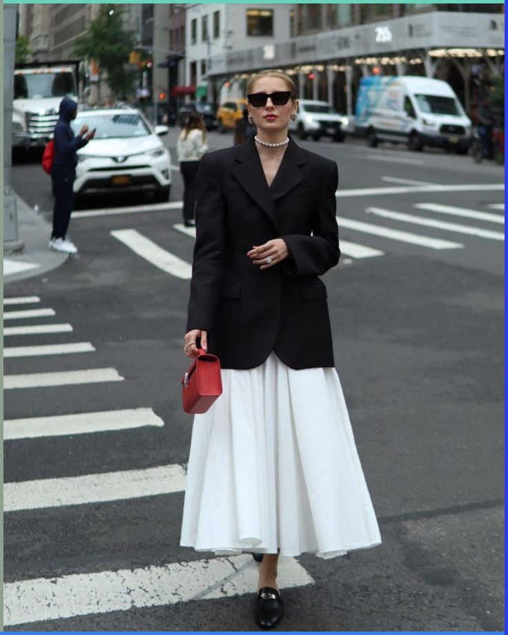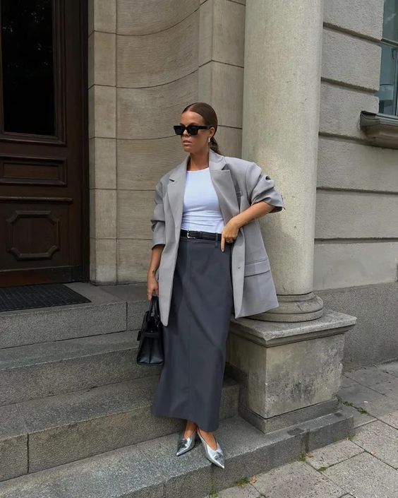 Per le personalità dall’animo profondamente chic, una combo look da provare è sicuramente quella che vede la gonna midi, che sia nera in satin o bianca eterea e leggera o di un colore neutro o scuro, abbinata a blazer over o perfettamente fittati.