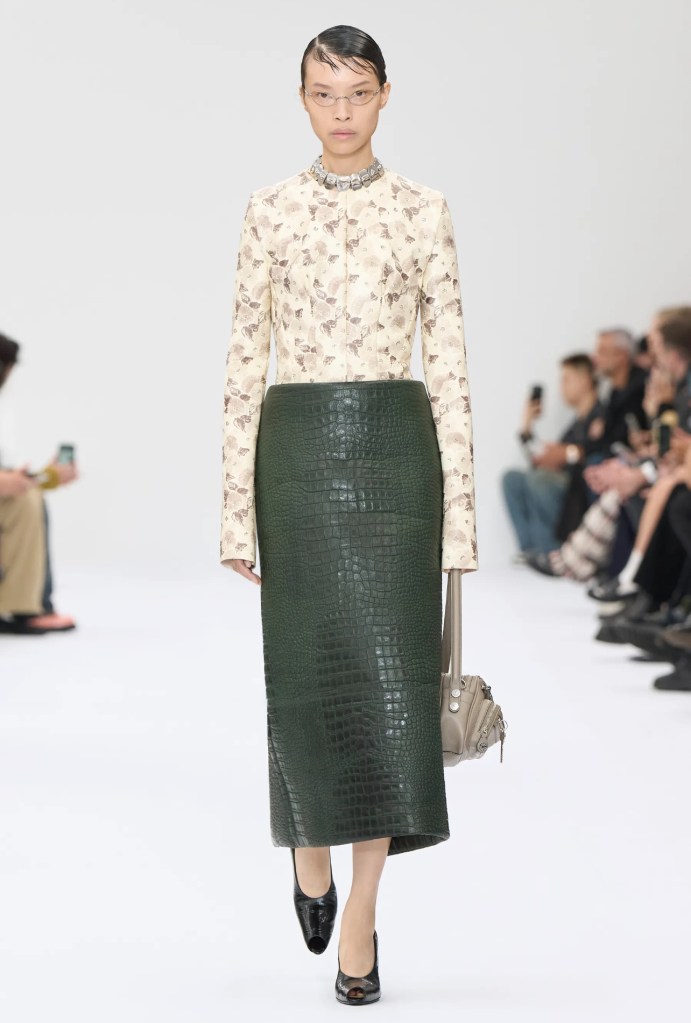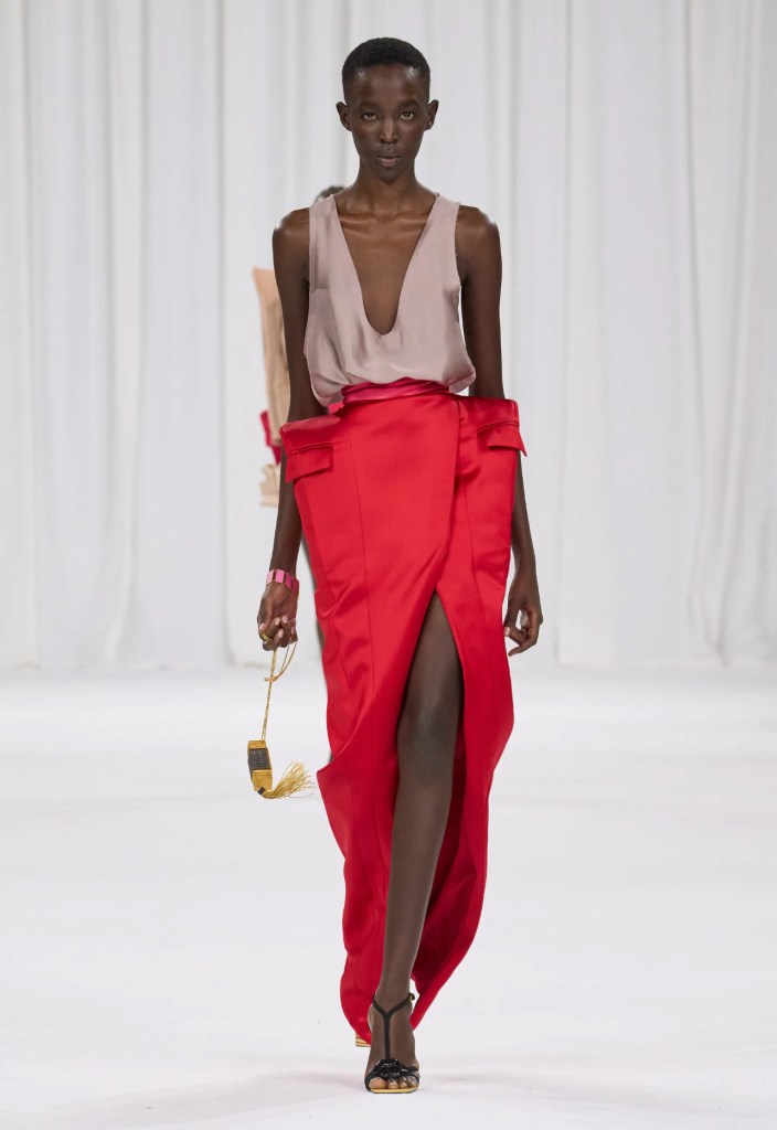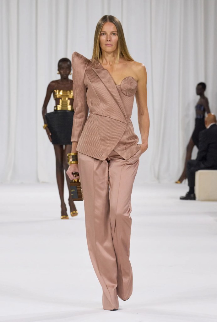 Olivier Rousteing pone al centro di questa collezione il corpo femminile attraverso dress scultorei ed enfasi materica, ricami di mani e volti femminili, bocche vermiglie e trucco marcato che generano l’illusione del reale su mini abiti dalle gonne cortissime e top portati sotto a giacche dalle spalle appuntite.