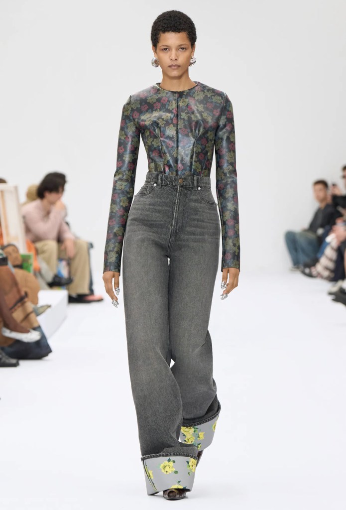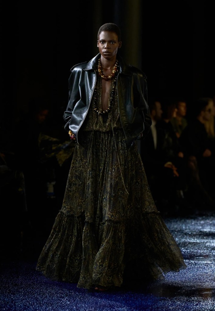 La sfilata per la Spring Summer 2025 di Saint Laurent firmata da Anthony Vaccarello si è aperta con abiti androgini XXL, simbolo dell’empowerment della maison, caratterizzati da giacche oversize, revers affilati, cinture in pelle lucida e cravatte sottili. Come d’un tratto, il normale andamento del défilé è stato stravolto da una nuova linea narrativa ed estetica, caratterizzata da una donna più colorata e festosa, in totale contrasto con l’office wear dei primi look. Le silhouette diventano scintillanti, investono motivi floreali e broccati; abbandonano la fluidità dei completi per fit più aderenti con dettagli in pizzo e una palette cromatica più audace. Il motto sembra essere: “work hard, play hard“.