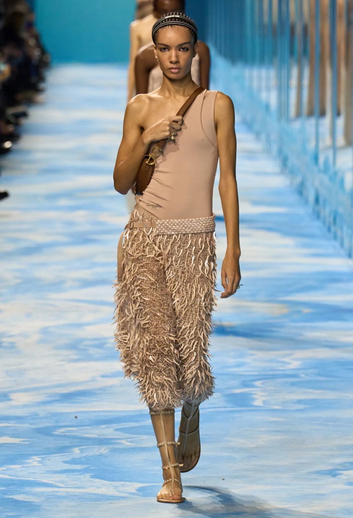 Capi sportivi, costumi e body diventano le parti principali del guardaroba, abbinati a gonne di frange, che celebrano il balletto nel mondo più sognante. Anche il mondo del motociclismo è predominante e irrompe sulle silhouette femminili con un’eleganza sussurrata.