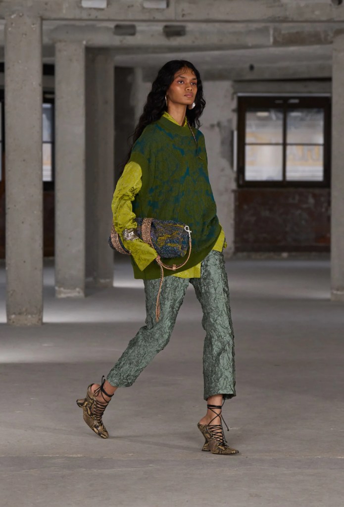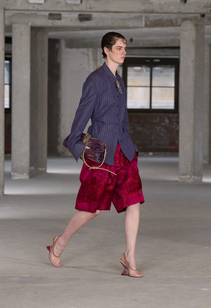 La SS 25 di Rabanne è un connubio di sportswear e glamour da sera, di abbigliamento tecnico e abiti eleganti, di maschile e femminile, declinato in una palette pastello a contrasto con effetti laminati oro e argento. Ad attirare l’attenzione le borse e più di tutte una riedizione in oro 18 carati dell’iconica Nano Bag creata da Paco Rabanne nel 1969. Una borsa composta da dischi metallici che il fondatore disegnò ispirandosi ai grembiuli all’epoca indossati dai macellai in Francia. Questa nuova versione mantiene l’inconfondibile silhouette del modello originale, ma reinterpreta quest’ultimo in una chiave ultra-preziosa. La Nano Bag di Dossena è infatti realizzata in oro 18 carati, il che, di fatto, la rende la borsa più costosa di sempre. Il suo valore? Sembra si aggiri intorno ai 250mila euro.