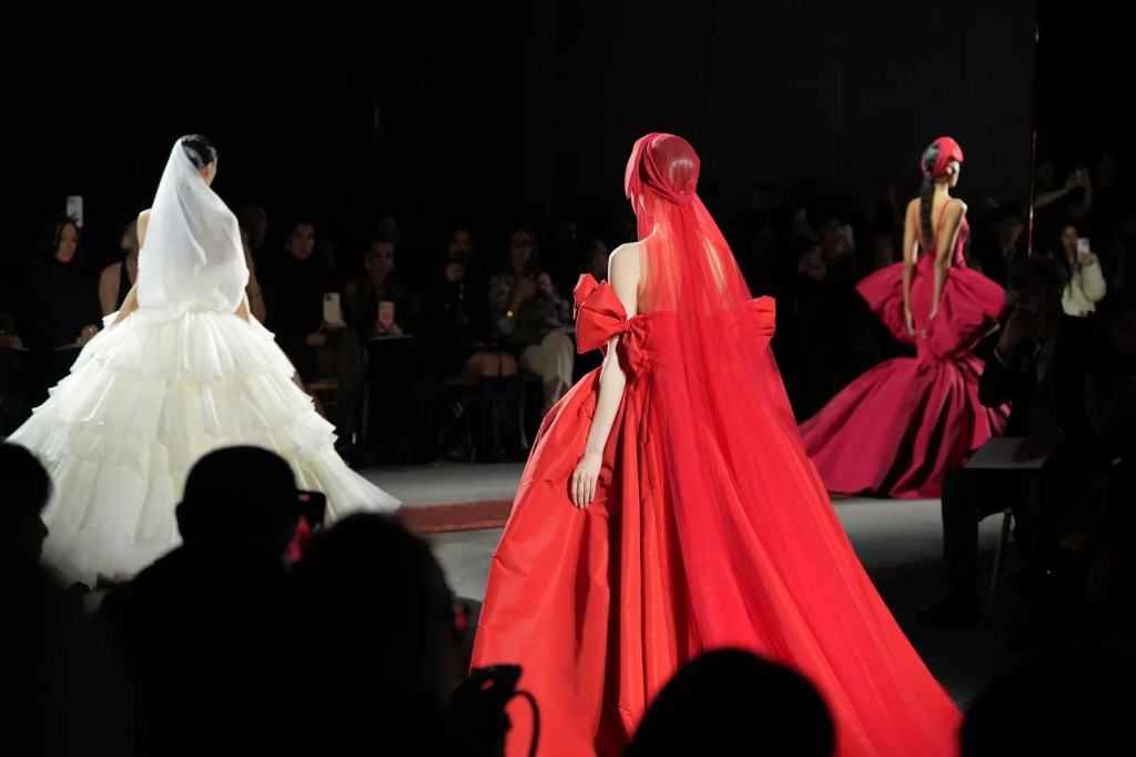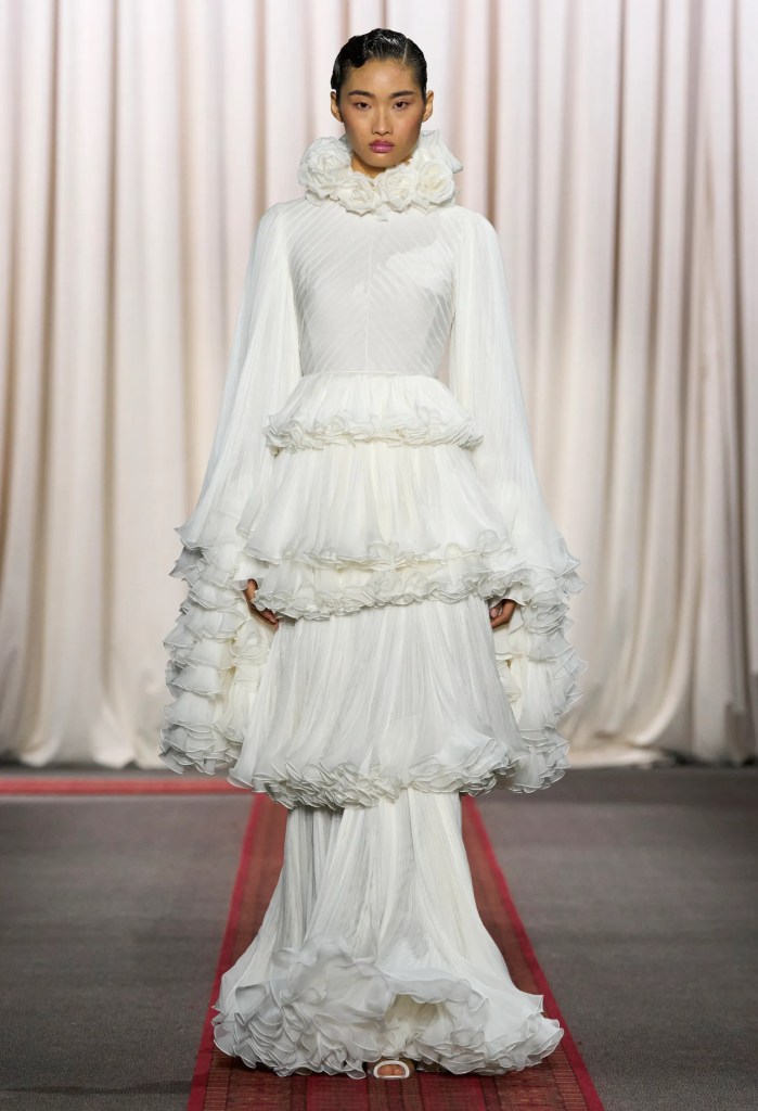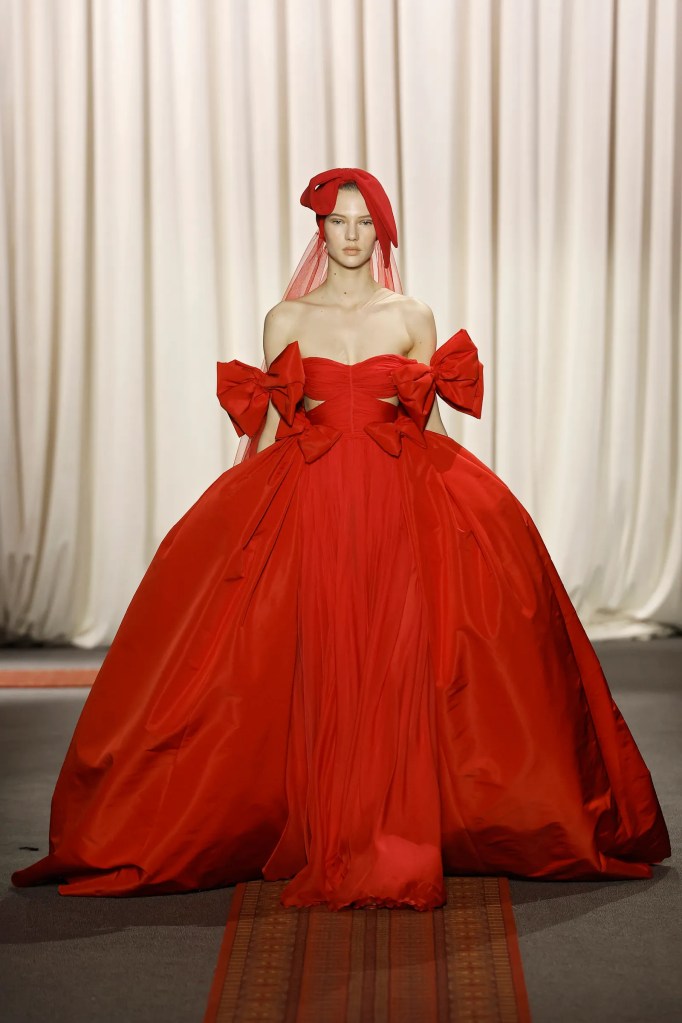 Le collezioni di Giambattista Valli sono sontuose, preziose, maestose. La Couture SS 25 incarna ancora una volta l’idea di favola, tra cascate di fiocchi, ruches, drappeggi, volumi esagerati e tessuti preziosi. Valli si focalizza principalmente sul mondo bridal, proponendo abiti da sposa romantici ma contemporanei, proponendo spose vestite di rosso, audaci e strong, proprio come una delle tendenze più inaspettate del 2025.