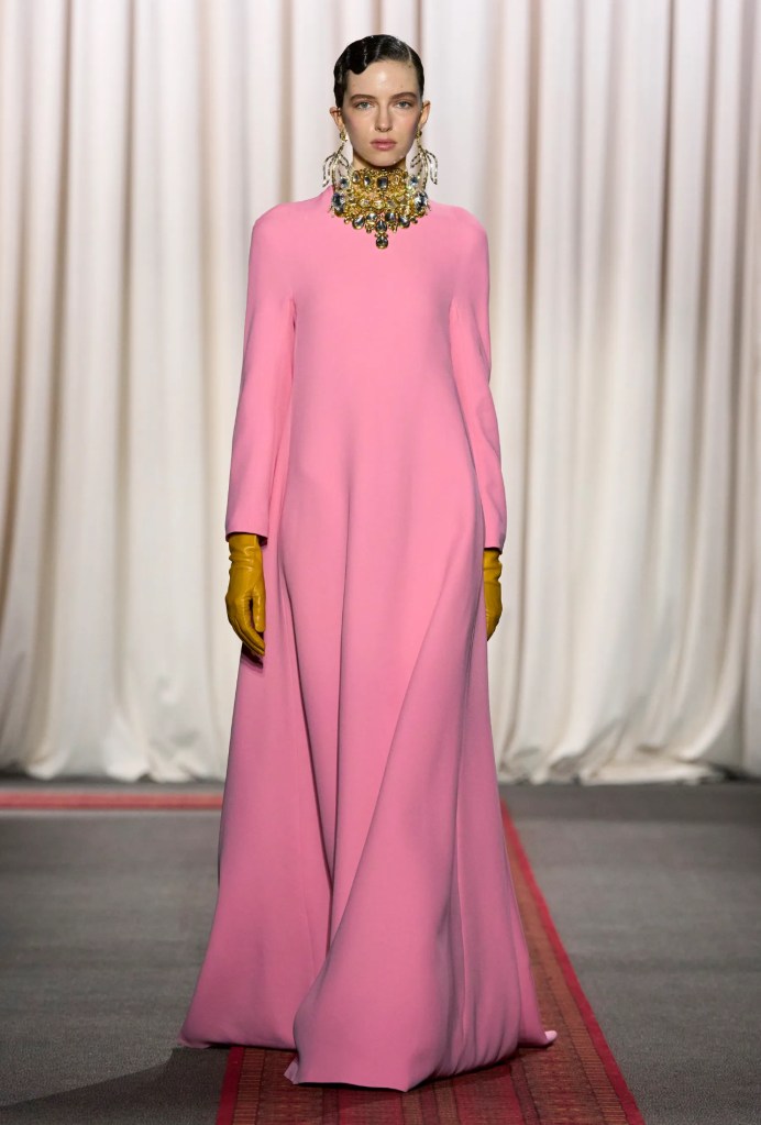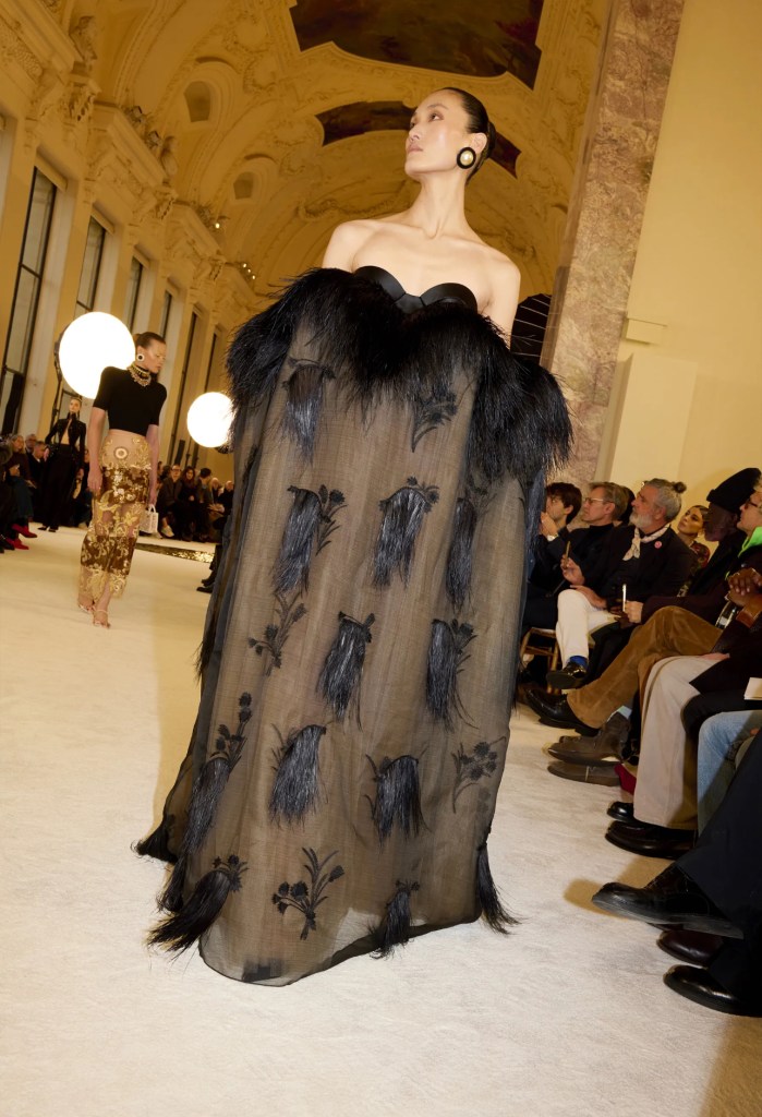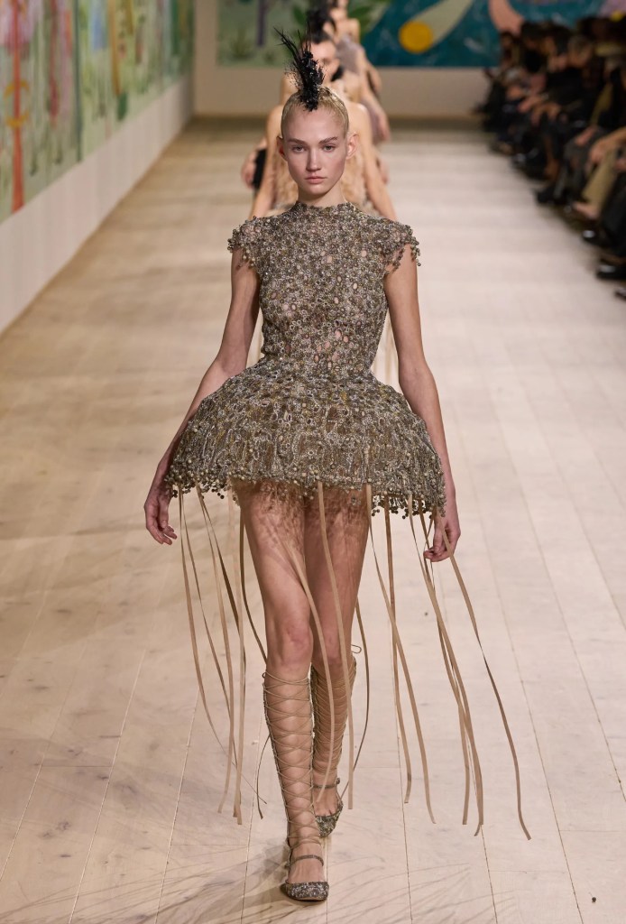 Roseberry sfida i confini dell’immaginazione volando su volumi scultorei e tessuti eterei, proponendo silhouette “deco liquido”, che scivolano sul corpo con naturalezza. La palette colori è delicata: il nude sostituisce l’uso tradizionale del nero, insieme al color burro, all’oro, al verde sbiadito, al marrone “toast” e al grigio caldo “visone”.