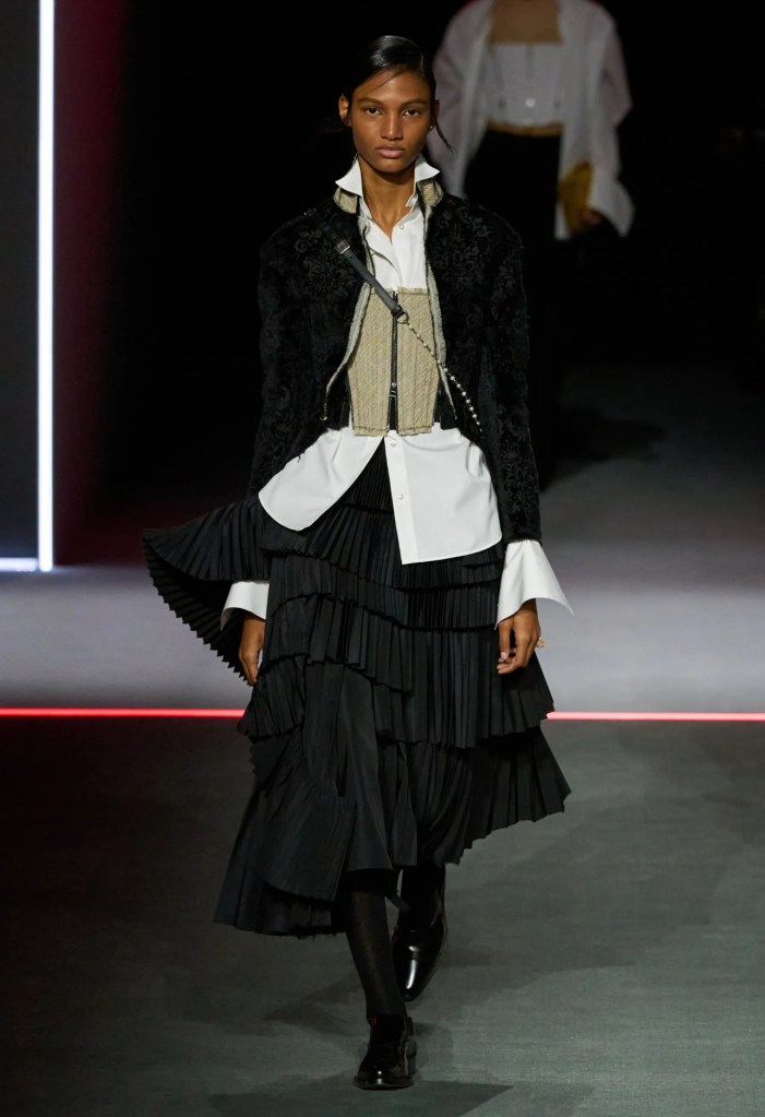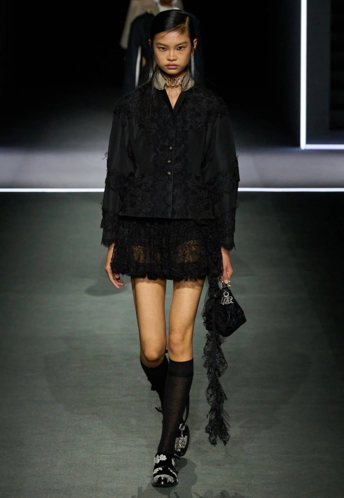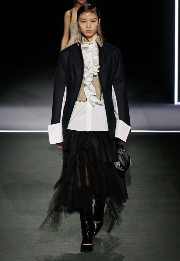 La direttrice creativa ha esplorato l’heritage della maison riportando in passerella alcuni dei capi che hanno fatto storia, così da creare connessioni tra passato, presente e futuro. La collezione dimostra come gli abiti siano lo strumento di una continua evoluzione, giocando con riferimenti culturali, stratificazioni e citazioni. L’elemento chiave della collezione è la gorgiera elisabettiana, ispirata a Orlando di Virginia Woolf e interpretata in chiave fluida e moderna. Anche le giacche maschili e i jabot diventano centrali, insieme a ruches da smontare e rimontare. Così la funzionalità quotidiana si contrappone ad una sensualità più formale e femminile, mentre i giochi di trasparenze e le sovrapposizioni creano contrasti tra leggerezza e struttura, con corsetti che diventano sportivi, abiti con ricami e pizzi decorativi, trasparenze sensuali, ruches voluminose e volant che invadono le silhouette, abiti di macramé, montoni, trench da città, giacche intrecciate e cappe di velluto nero.