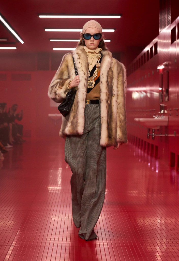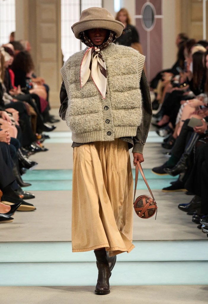 La collezione è perfettamente allineata con la sua location e i look in passerella sono corredati da accessori ad hoc, tutti sublimati: coloratissimi bauli portatili, plaid arrotolati, sciarpe d’artista, cappelliere e alcune bellissime reinterpretazioni delle mitiche borse della maison, come le Speedy e Keepall. Lo stesso Ghesquière spiega che il defilè racconta di “incontri, separazioni, riunioni, viaggi di gruppo. Tutti questi incroci attraversano il tempo e la vita delle persone”. Aggiunge che molte inspo derivano da scene di film come A qualcuno piace caldo a 2046, Casablanca, Snowpiercer, Breve incontro a Ceux qui m’aiment prendront le train…, Delitto sull’Orient Express.