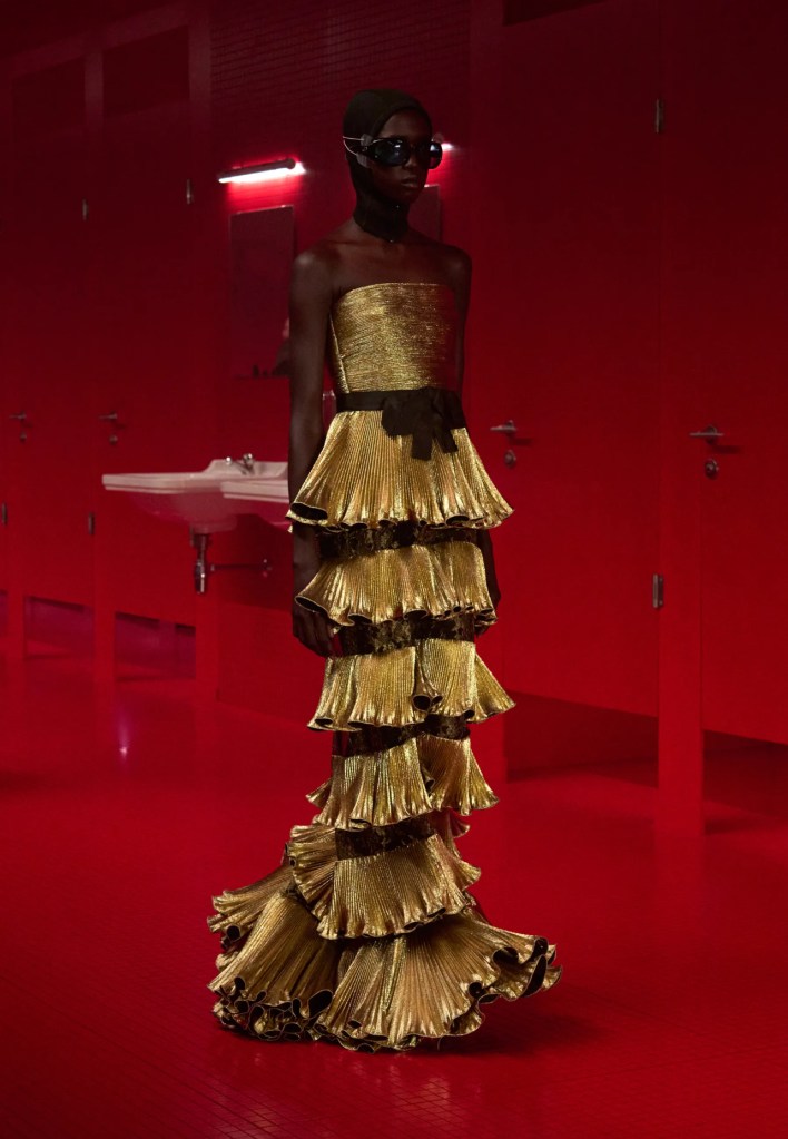 Il fashion show di Alessandro Michele per Valentino ci ha ricordato che quella che crediamo essere la nostra intimità non è che un “teatro nel teatro”. Ed è proprio in un bagno pubblico, davanti a porte tinte dell’iconico rosso Valentino che si aprono e chiudono, che prende vita l’idea dell’intimità secondo Michele. Un soggiorno in cui ogni ospite non è stato solo spettatore di una rappresentazione, ma protagonista di una riflessione che indaga sulla complessità delle definizione del sé rispetto all’io e all’altro. In Le Méta Théâtre des Intimités, Alessandro Michele ha citato Romano Màdera e Michel Foucault, David Lynch e Paul Valéry, Ludwig Wittgenstein, Hannah Arendt e Mario Perniola.
