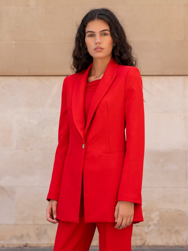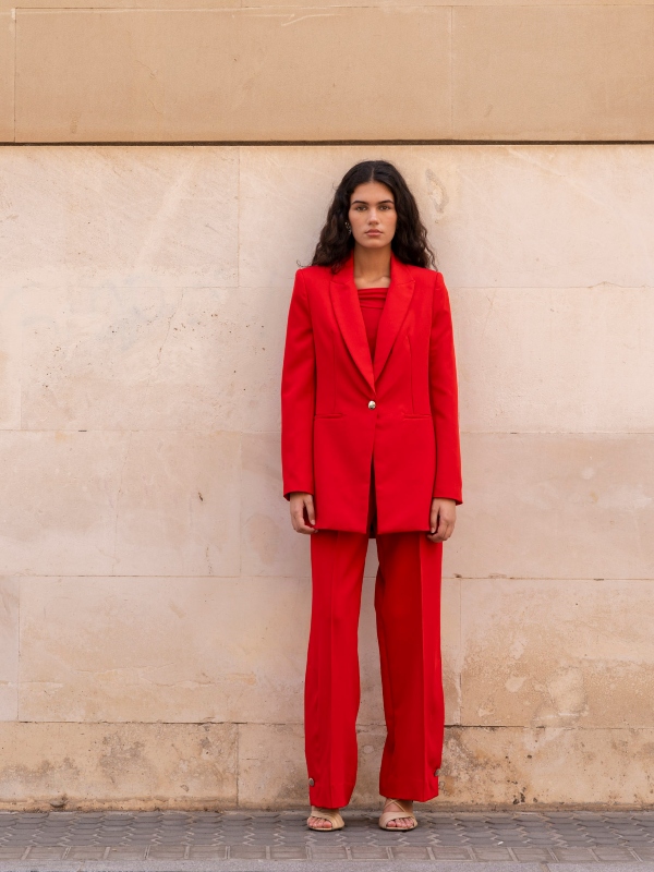 In rosso passione, un tailleur dal taglio diverso dei precedenti: giacca lunga monopetto e bottone in argento e pantaloni dritti a vita alta.