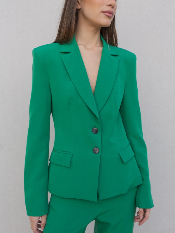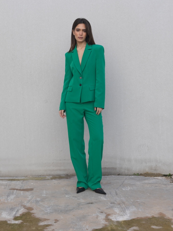 - Il Tailleur è on trend così come il verde. Qui giacca dal taglio sartoriale con collo a scialle, chiusura a due bottoni e tasche con patta abbinato a pantaloni a gamba dritta con vita alta.
