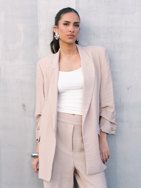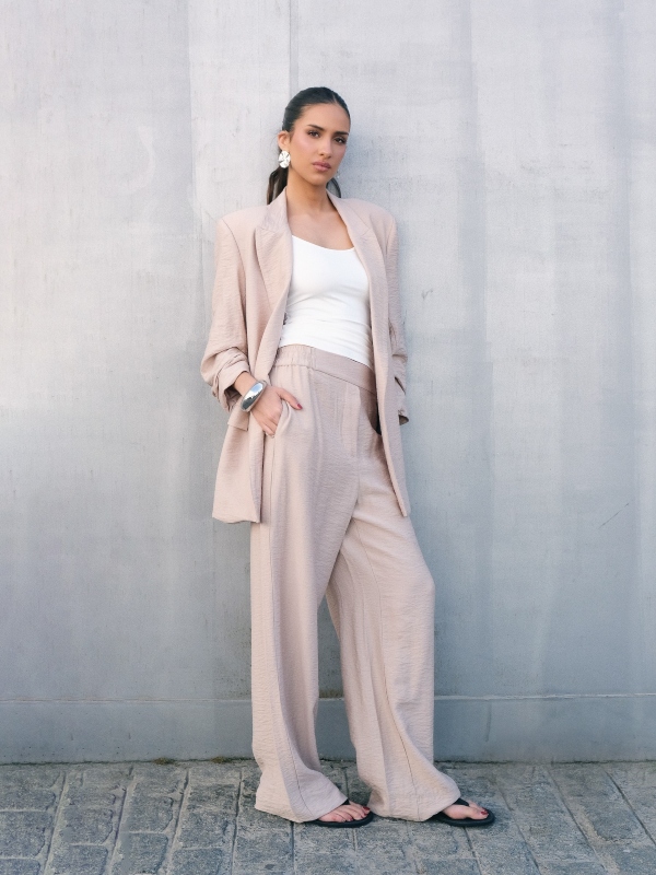 - Primo fra tutti, il tailleur beige con giacca a manica lunga in tessuto morbido con spalline e i pantaloni con gamba ampia e fluida con elastico in vita e tasche aperte laterali.