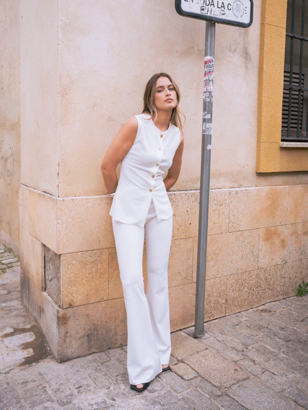 - Il top gilet senza maniche con scollo rotondo e bottoncini oro si abbina perfettamente ai pantaloni a vita alta con gamba stretta che svasano dal ginocchio. Disponibile nelle due classiche varianti colori bianco e nero, questo completo si presta ad ogni occasione e si può sfoggiare insieme o separatamente, o addirittura mixando i due colori.
