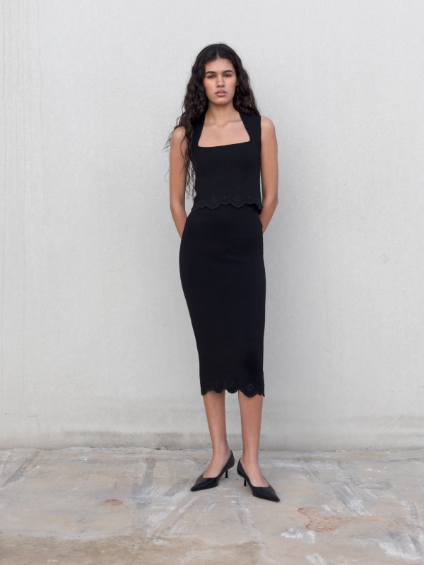 - In comodo tessuto elasticizzato, il set coordinato con top corto senza maniche, scollo quadrato e ricamo sull’orlo e gonna midi in maglia.