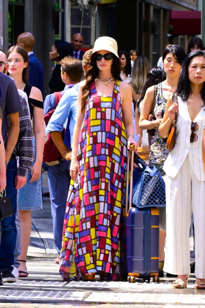Tra I look più chiacchierati quello che l’ha vista indossare un abito patchwork a colori, un modello che fa parte della collezione Spring/Summer 2025 di Gabriela Hearst. L’abito in lino, con spallina larga e gonna ampia e morbida, è interamente coperto da un disegno geometrico multicolor con forme squadrate dipinte a mano, legate tra loro da una cucitura marrone che crea l’effetto finale tipico delle lavorazioni patchwork. Il vestito è abbinato a sandali platform di Chloé, occhiali da sole L.G.R. modello Khartoum, ad un bucket hat in paglia profilato in fucsia e allo Squash Blossom choker con perle in oro di Marlo Laz. Ai più attenti, non saranno sfuggiti la borsa blu di Fendi e la custodia per vestiti con il logo di Runway.